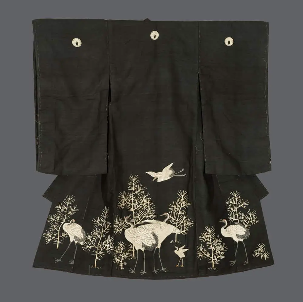 The motifs carry profound symbolic weight in Japanese culture: cranes (tsuru) are revered as symbols of longevity, good fortune, and fidelity, often associated with the belief that they live for a thousand years, while pines (matsu) represent endurance, immortality, and constancy through all seasons. Together, these elements create an auspicious composition befitting formal or ceremonial wear. The artistic style reflects the influence of traditional Japanese painting schools, particularly the naturalistic approach seen in bird-and-flower (kachō-ga) paintings.