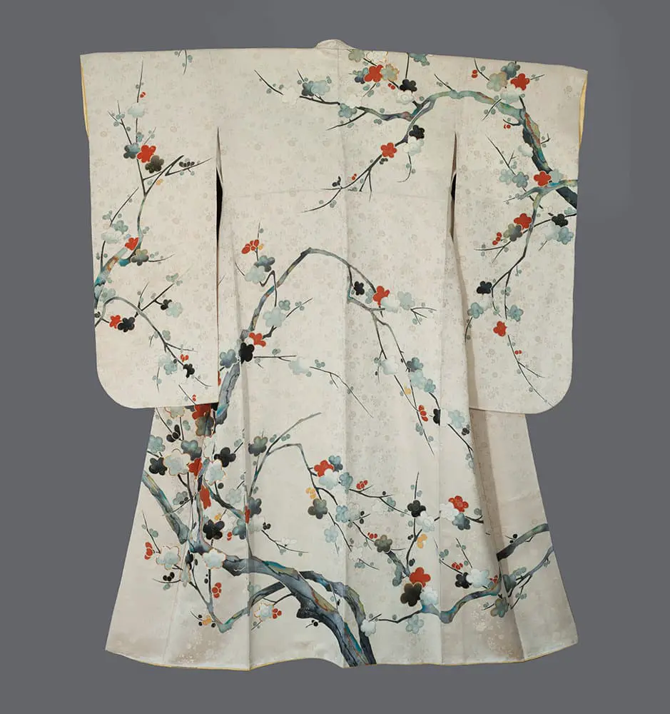 This rinzu silk furisode represents a beautiful fusion of traditional Japanese textile artistry with the naturalistic aesthetic that has long characterized Japanese decorative arts. The kimono features an elegant composition of ume (plum blossom) branches gracefully cascading across the cream-colored damask ground, painted with the sophisticated yuzen resist-dyeing technique combined with pigment dyes. The artistic treatment evokes the classical Japanese painting tradition of kachō-ga (bird-and-flower painting), where natural subjects are rendered with both botanical accuracy and poetic sensibility.