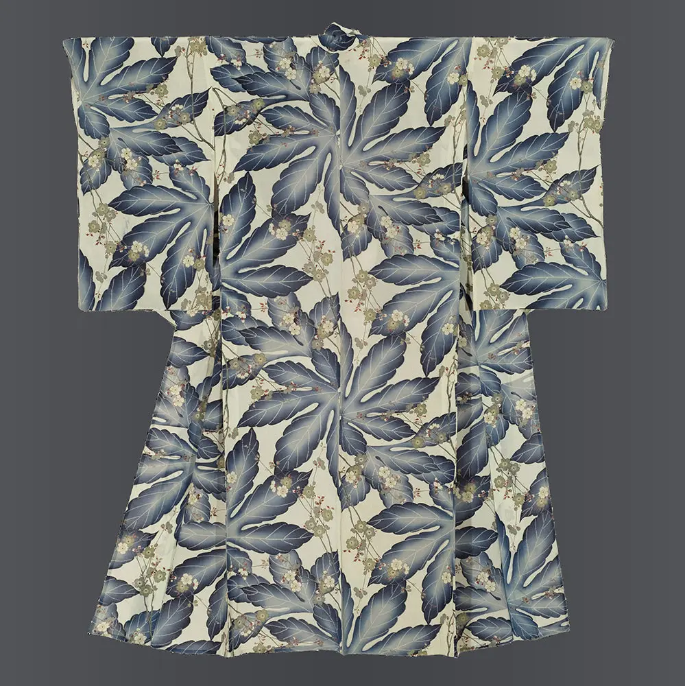 The artist's use of fatsia japonica leaves as a motif on a Japanese kimono is rare. Fatsia japonica, commonly known as 'yatsude,' is a frequently found household garden plant in Japan. The large evergreen leaves resemble outstretched hands, symbolizing the gathering of good fortune and prosperity. With typically 7 or 9 'fingers' per leaf, odd numbers are considered to bring good luck according to Japanese tradition.
