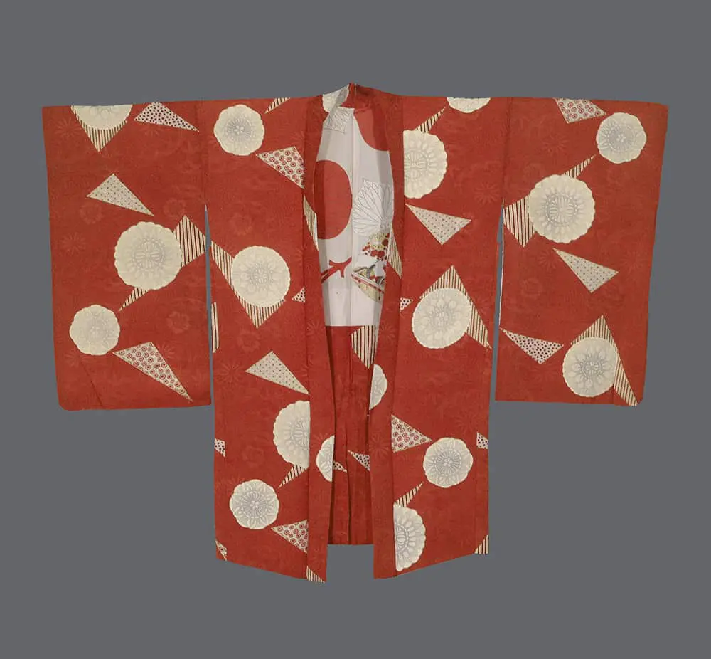 This rinzu silk haori showcases flowers and triangle patterns on a medium red background. It's in very good condition, measuring 50 inches (127 cm) from sleeve-end to sleeve-end and standing at 37 inches (94 cm) tall.