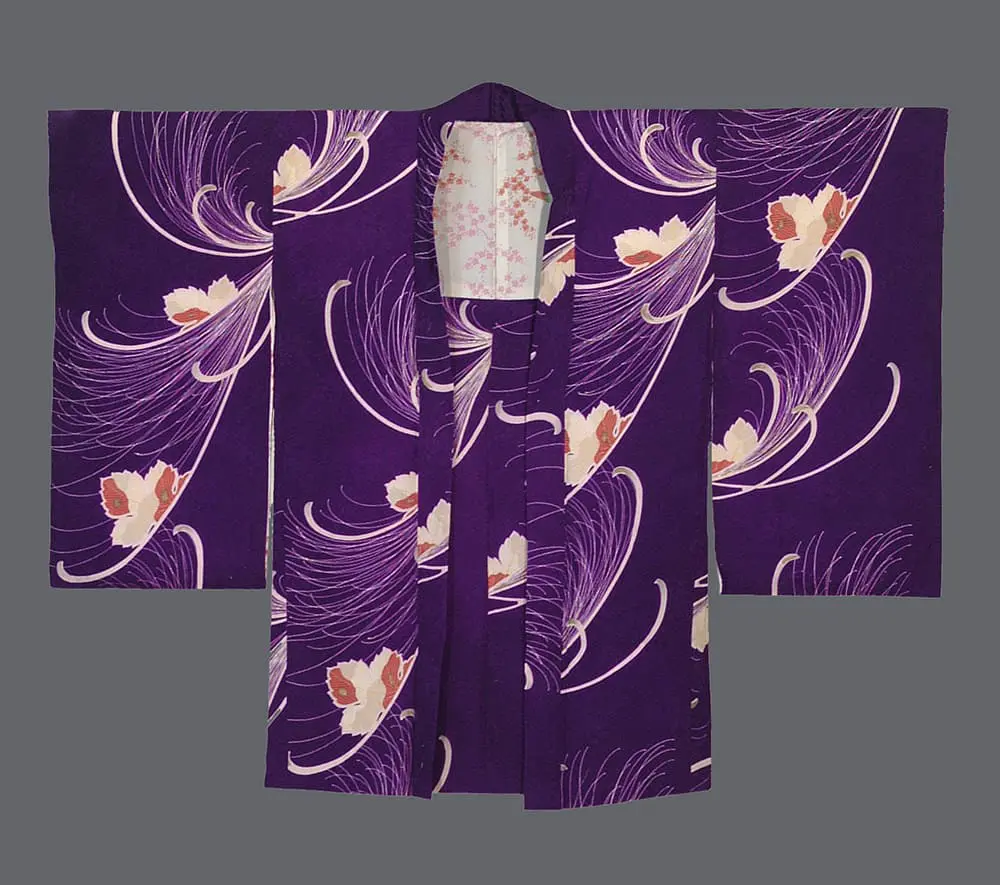 This rinzu silk haori showcases the elegant susuki (Japanese pampas grass) motif rendered through the sophisticated kata-yuzen dyeing technique, enhanced with delicate surihaku gold outlining against a rich purple ground. The design captures the graceful, flowing movement of pampas grass plumes as they bend and sway in autumn winds, their feathery seed heads depicted in cream and pale tones that seem to dance across the luxurious damask silk surface. The rhythmic curves and sweeping lines of the grass create a sense of natural motion and seasonal transition, while the subtle gold accents add luminous definition to each delicate frond. Among these arcs of grass appear kikyo (bellflowers), recognizable by their five-pointed petals; they are another emblem of autumn and suggest steadfastness and unchanging love.
