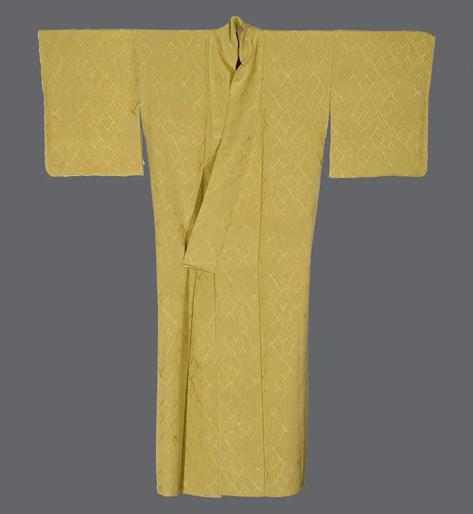 This elegant rinzu damask kimono showcases the sophisticated interplay between color, texture, and symbolic meaning that characterizes high-quality Japanese textiles. The garment's luminous golden-yellow hue speaks to both luxury and auspiciousness in Japanese culture, where gold represents prosperity, enlightenment, and divine favor. The monochromatic color scheme allows the subtle beauty of the damask weaving technique to take center stage, creating a sophisticated visual experience that relies on textural variation rather than contrasting colors for its impact.