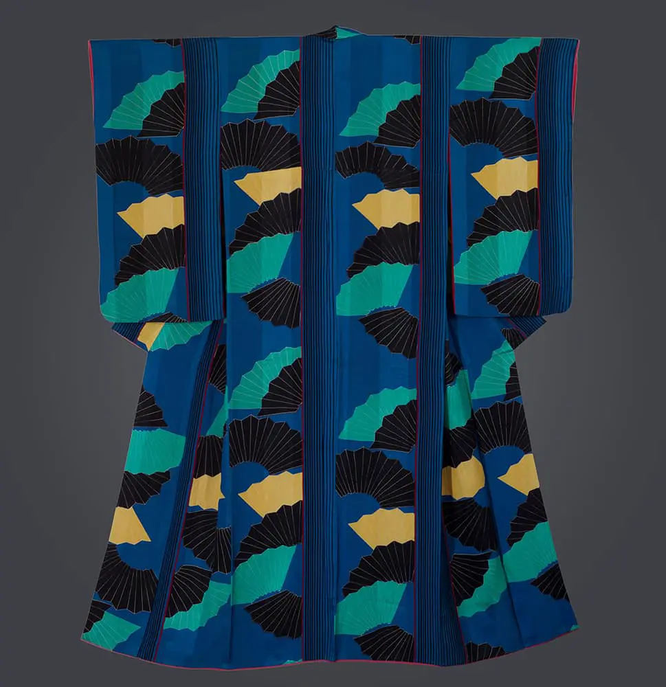This rinzu kinsha kimono represents a masterful exploration of geometric abstraction that bridges traditional Japanese motifs with the emerging modernist sensibilities of the late 1930s. The composition demonstrates remarkable sophistication in its treatment of the fan (sensu) motif, transforming this classical symbol into a dynamic study of color, form, and spatial relationships.