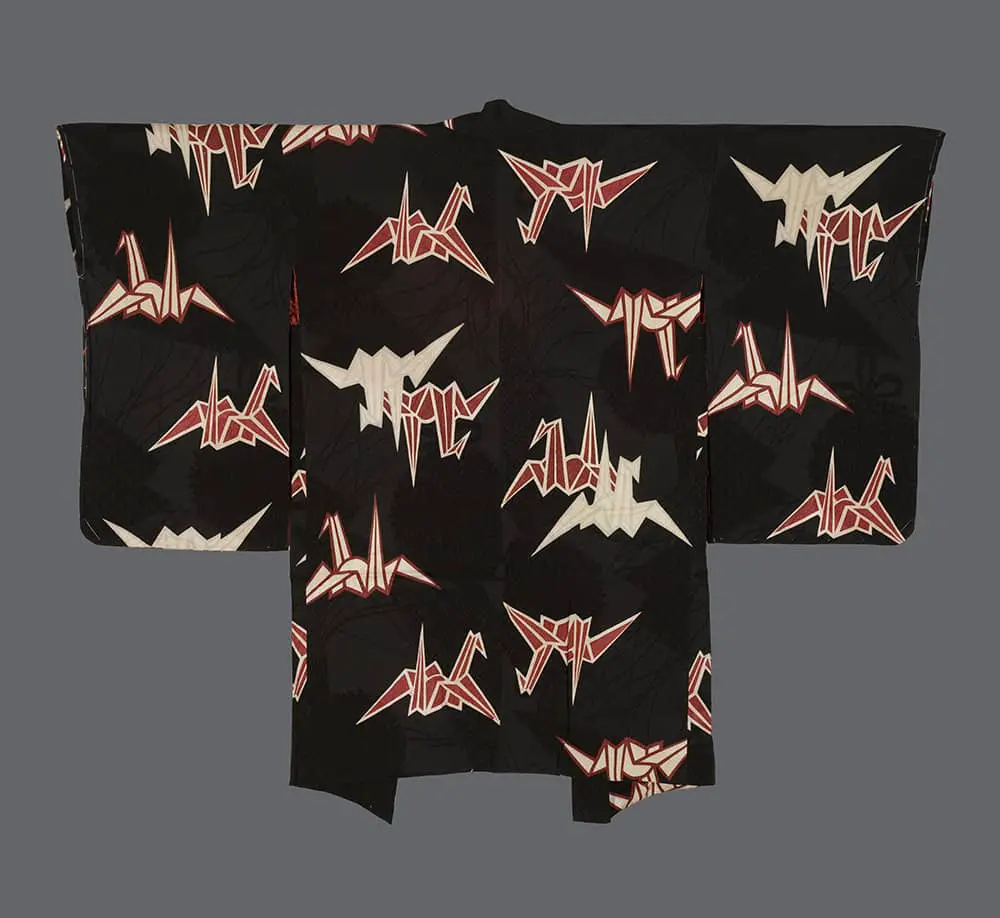 This haori has as its dominant motif a scattering of origami cranes, rendered in a highly stylized, almost abstract manner. The cranes are painted in a bold red and white color scheme, with crisp outlines that give them a graphic, almost logo-like quality. The subtle woven patterns in the rinzu silk create an additional layer of complexity, allowing the cranes to stand out more vividly while maintaining a sense of harmony and balance in the overall composition.