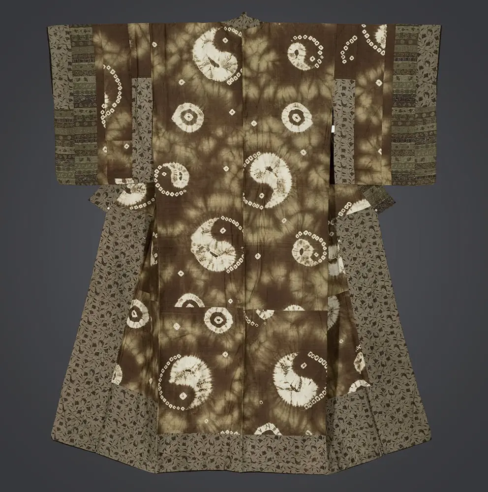 This silk dounuki exemplifies sophisticated layering of dyeing techniques. The central bodice showcases an extraordinary application of shibori resist-dyeing to create taijitu (yin-yang) symbols, where the complex binding and compression techniques produce the characteristic radiating patterns and organic, cloud-like backgrounds. The shibori process creates those distinctive starburst effects around each circular motif, with the resist-dyed areas preserving the white silk while allowing the surrounding fabric to absorb rich brown and sepia tones in unpredictable, naturalistic patterns.