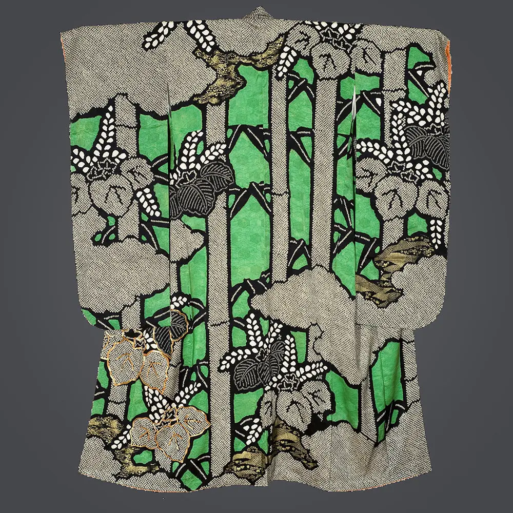 The strategic incorporation of metallic gold elements—both in the delicate stenciled motifs scattered throughout the design and in the couching that outlines the prominent paulownia—adds layers of textural and visual sophistication that elevate the piece beyond simple two-tone design. This technique shows influence from contemporary Japanese avant-garde fashion, where traditional motifs were being reinterpreted through bold graphic treatments. The shibori technique itself lends an organic, hand-crafted quality that contrasts beautifully with the geometric precision of the gold accents, creating a dialogue between spontaneity and control that characterizes much of the innovative textile work of this period. The overall effect suggests connections to the Japanese mono-ha (school of things) art movement, with its emphasis on natural materials and processes, while simultaneously engaging with international trends toward graphic boldness and material experimentation.
