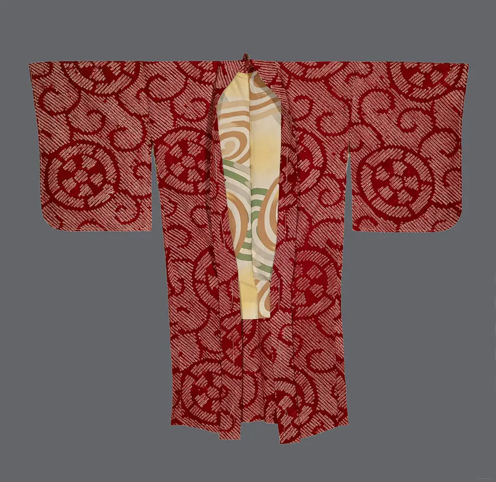 This silk haori is a captivating example of mid-century textile artistry, utilizing the ancient shibori (tie-dye) technique to create a bold, rhythmic composition. The garment is rendered in a deep, saturated russet-red, which serves as a rich architectural field for its high-contrast surface decoration.