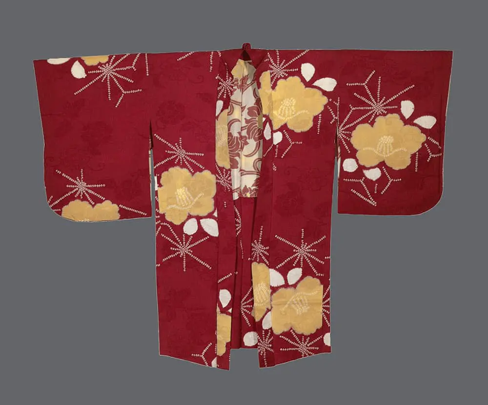 This silk haori is a striking example of textile design, utilizing high-contrast botanical imagery to create a sense of rhythmic movement. The garment is rendered on a deep burgundy-red rinzu (damask) ground, providing a lustrous architectural field for its surface decoration.