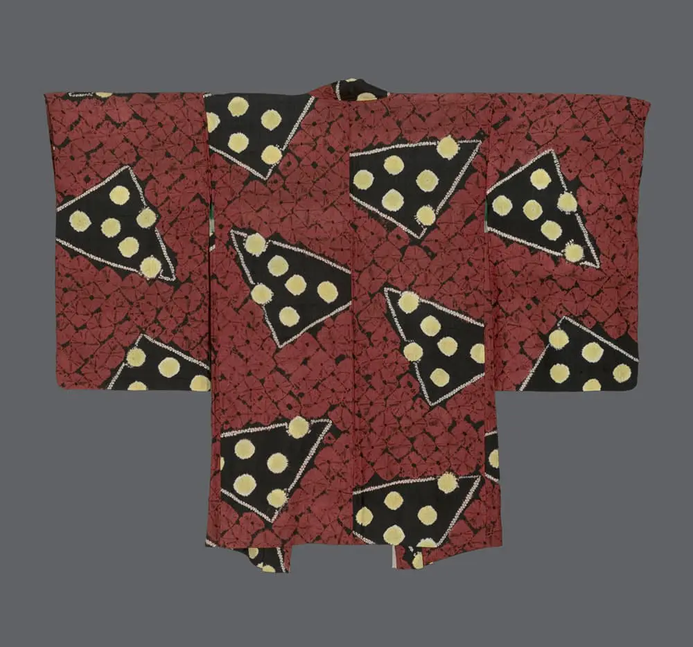 A dynamic and eye-catching pattern characterizes this silk piece through striking shibori motifs. The background features rich red shibori on black, providing a vivid and contrasting canvas for black and yellow triangular motifs. The black and yellow combination adds depth and intrigue to the design, with the shibori yellow dots adding a playful and dynamic element. The seemingly random placement of the triangles creates a sense of movement across the fabric, while the consistent use of motifs maintains visual cohesion. The clean lines and sharp contrasts in this haori echo the sleek, modern aesthetic that characterized Art Deco, bringing a sense of order and structure to the design. The playful and abstract nature of the motifs hints at elements of Modernism, particularly in the way the forms are simplified and stylized.