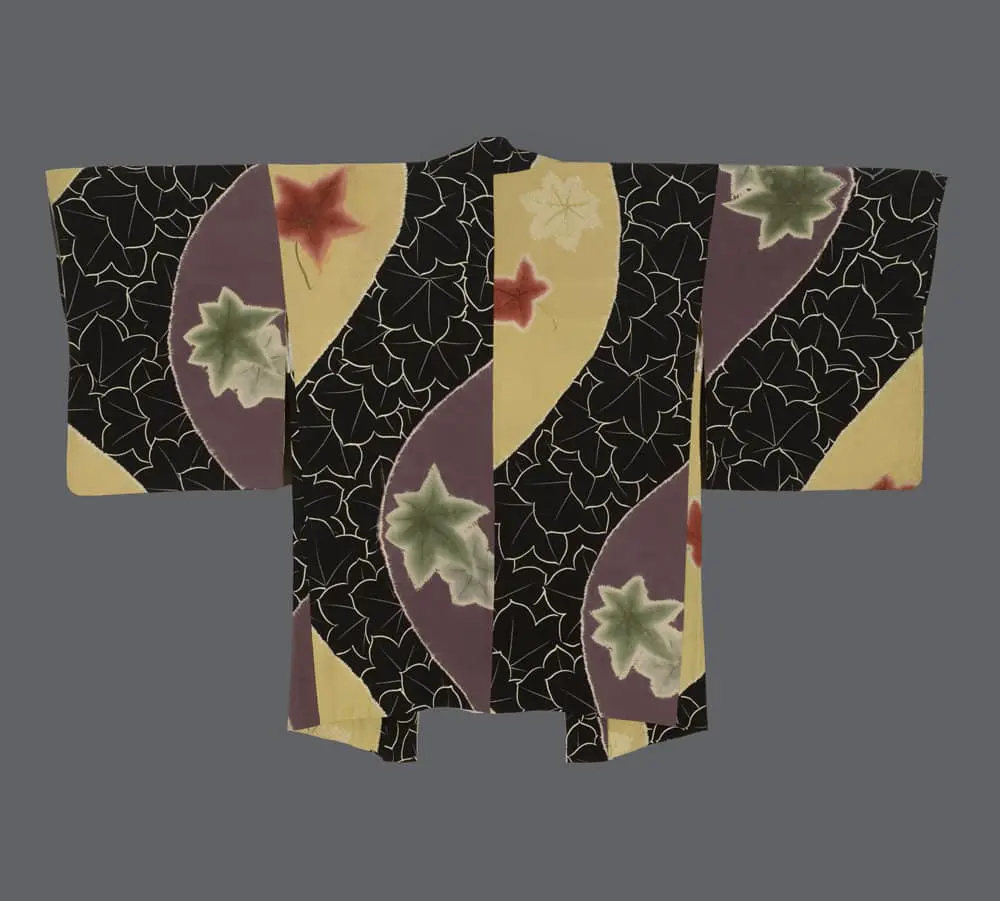 Bold modernist aesthetics emerge in this piece through a dynamic composition that brilliantly merges traditional Japanese motifs with contemporary sensibilities. The design incorporates sweeping curved bands in mauve and butter yellow, creating dynamic movement across a black background patterned with delicate linear shibori-created maple leaf outlines. The placement of sage green and coral-red maple leaves as focal points within these curving bands demonstrates a sophisticated understanding of asymmetrical balance that is quintessentially Japanese. The overall composition shows remarkable parallels with Art Nouveau's flowing lines and nature-inspired motifs. Additionally, the way the curved bands slice through the space creates a striking sense of dynamism that also aligns with aspects of Art Deco's geometric boldness. The black background's intricate maple leaf pattern, rendered in fine white outlines, creates a complex negative space that adds depth and sophistication to the overall design.