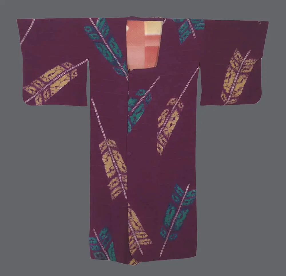 The arrow feather motif carries deep symbolic significance in Japanese culture, representing protection from evil, the warding off of misfortune, and the idea of moving forward without looking back - making it a popular choice for celebratory garments and New Year festivities. The artistic treatment here reflects the influence of the Mingei (folk craft) movement that was gaining momentum during this period, which celebrated the beauty of functional objects and traditional craftsmanship. The bold, geometric arrangement of the feathers against the dark background also shows subtle Art Deco influences that were permeating Japanese design in the interwar period, particularly in the striking diagonal composition and the confident use of contrasting colors.