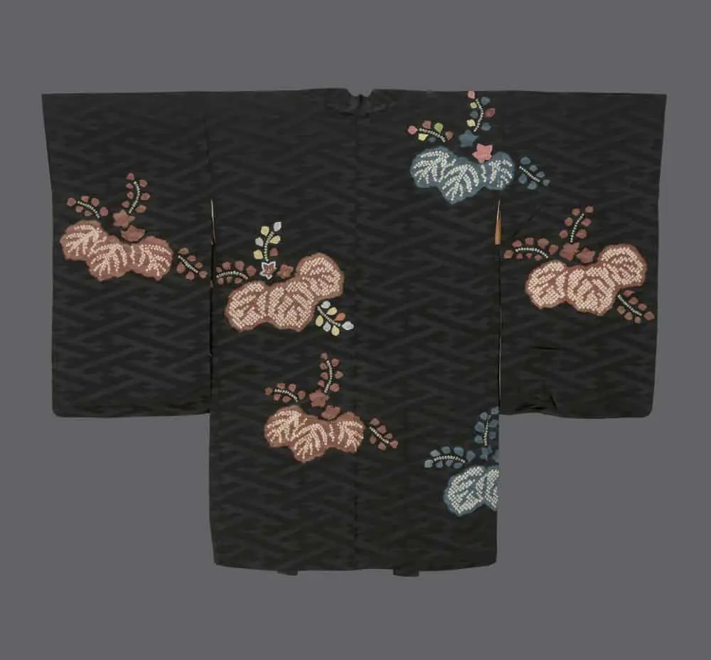 An elegant combination of techniques distinguishes this piece, featuring shibori-dyed paulownia motifs set against a sophisticated rinzu base cloth with a sayagata pattern. The design shows paulownia leaves and flowers in soft coral pink and occasional pale blue hues, with the rinzu background creating subtle geometric texture in deep black that adds depth and sophistication to the overall composition. The shibori technique used to create the paulownia motifs demonstrates exceptional technical mastery, with the tied-resist dyeing creating subtle gradations and textures within each leaf form. The precision of the shibori work is particularly evident in the detailed veining patterns within the leaves. Small floral elements in coral and blue-green accompany the paulownia leaves, adding delicate vertical accents to the composition. The prominent rinzu base fabric deserves special attention - its sayagata pattern creates a subtle play of light and shadow that adds sophistication and depth to the black background. This type of damask weaving represents a high level of textile craftsmanship, as the pattern must be woven into the fabric itself before any dyeing takes place. The interaction between the woven pattern and the shibori-dyed motifs creates a rich interplay of textures and visual depths. The composition shows remarkable restraint in its asymmetrical arrangement of motifs, embodying the Japanese aesthetic principle of "ma" (negative space) while creating a sense of movement across the garment. The overall design achieves a perfect balance between the technical complexity of its execution and the refined simplicity of its appearance, demonstrating the sophisticated intersection of multiple Japanese textile traditions. The subtle sheen of the rinzu weave adds an extra dimension of visual interest as the fabric moves, creating a dynamic interaction with light that enhances the three-dimensional quality of the shibori-dyed elements.