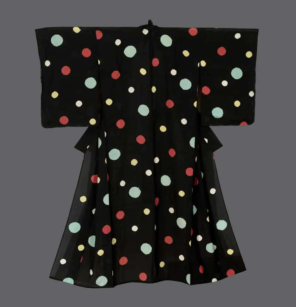 The design represents a fascinating cultural moment where Western motifs were being absorbed into Japanese fashion. The polka dot pattern, originally a European textile motif that became popular in the late 19th and early 20th centuries, has been reimagined here through the distinctly Japanese lens of shibori dyeing. This creates circles with the characteristic soft, organic edges that tie-dye produces, giving the geometric polka dots a more fluid, hand-crafted quality than their Western counterparts.