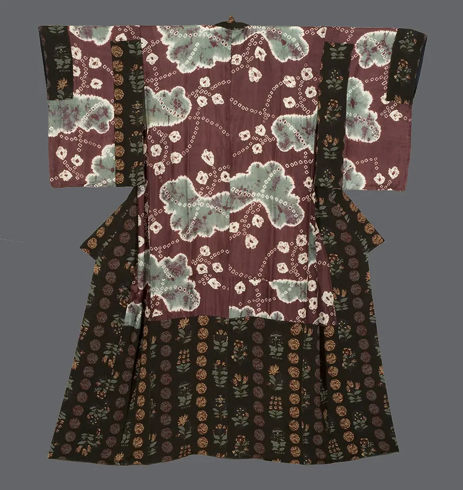 The lower sections and sleeves display sarasa-style chirimen silk, a crinkled silk fabric decorated with densely packed floral patterns that reflect the Japanese interpretation of Indian chintz designs that became popular during the Edo period. The detailed view reveals the intricate complexity of this patterning, with stylized flowers and foliage rendered in multiple colors against the dark ground, demonstrating the period's fascination with exotic textile traditions filtered through Japanese aesthetic sensibilities. As an undergarment, this dounuki would have provided both warmth and an additional layer of luxury that, while largely unseen, contributed to the wearer's sense of completeness and refinement. The combination of shibori's spontaneous, nature-inspired effects with the controlled repetition of sarasa patterns creates a sophisticated dialogue between chance and design, embodying the Meiji era's ability to synthesize traditional Japanese techniques with influences from broader Asian textile traditions. This garment exemplifies the Japanese principle that beauty should exist at every level of experience, even in elements hidden from public view.
