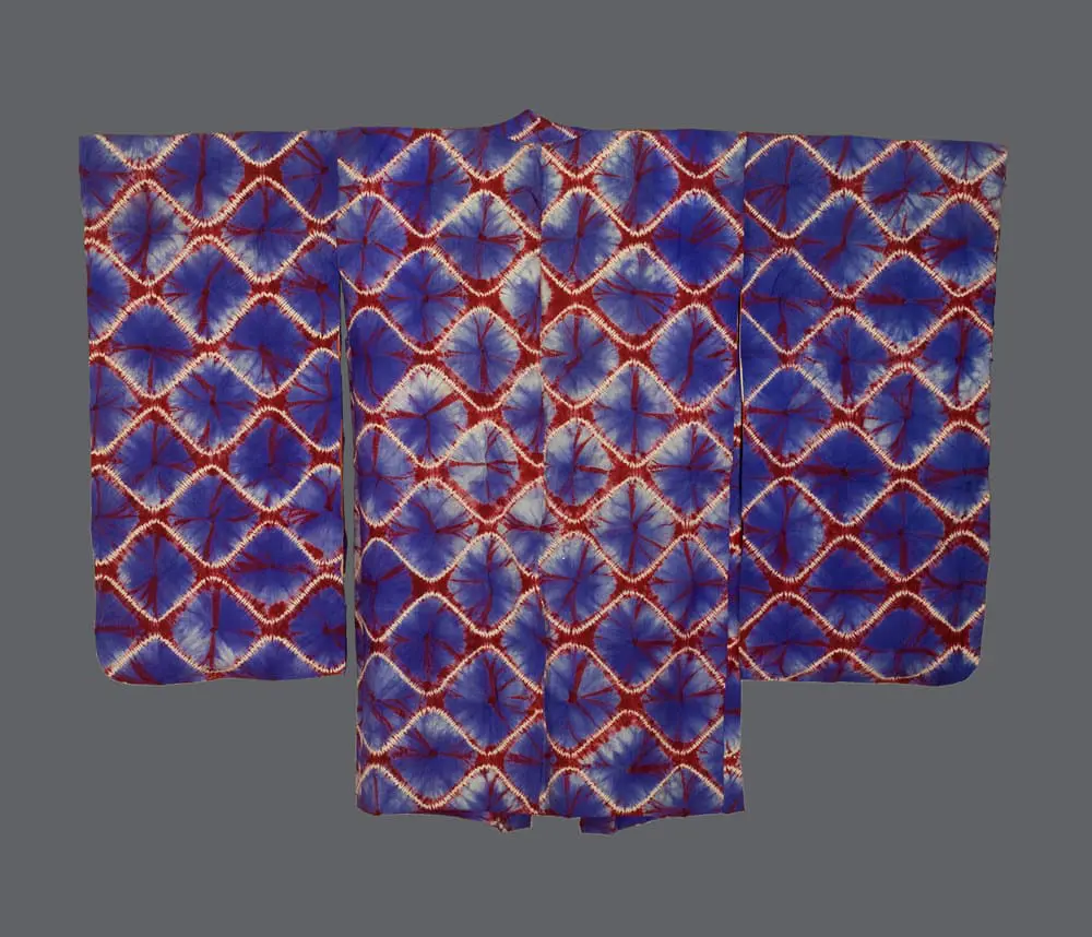 This haori is a vivid example of the shibori dyeing technique, presenting an eye-catching geometric pattern, creating a mesmerizing visual effect. The dominant color is a rich, vibrant blue that ranges from deep indigo to lighter azure tones. This blue is contrasted by a warm reddish-orange that forms a lattice-like structure across the fabric, dividing it into diamond-shaped sections. The shibori technique used here demonstrates exceptional skill and precision, yielding a starburst or radiating effect within each diamond, with the blue dye fading outward from a central point, creating a sense of depth and dimensionality. The bold geometric pattern and vibrant color contrast are reminiscent of Op Art, which emerged in the West during the 1960s and focused on creating optical illusions and visual effects. The repetitive diamond shapes and their internal radial patterns call to mind the work of artists like Victor Vasarely or Bridget Riley. The intense, saturated colors used in this haori also hint at influences from the Psychedelic Art movement, which celebrated vibrant and contrasting color palettes to create visually stimulating and almost hallucinogenic experiences. The interplay of blue and red within the diamond shapes, with white highlights accentuating the pattern, contributes to this bold and dramatic aesthetic. The overall composition, with its rhythmic, all-over pattern, also shares qualities with certain Abstract Expressionist works, particularly those exploring color field techniques.
