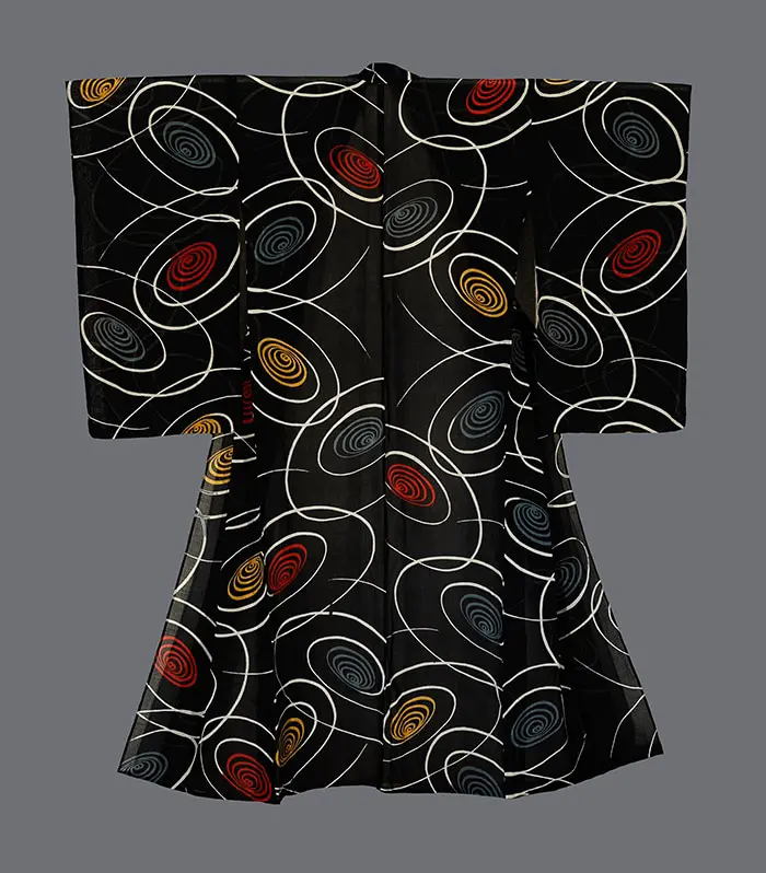 This 1950s kimono exemplifies the sophisticated artistic sensibilities of post-war Japanese textile design, where traditional techniques were employed to create distinctly modern visual experiences. The composition presents a mesmerizing field of spirals that seems to pulse with kinetic energy against the deep black ground.