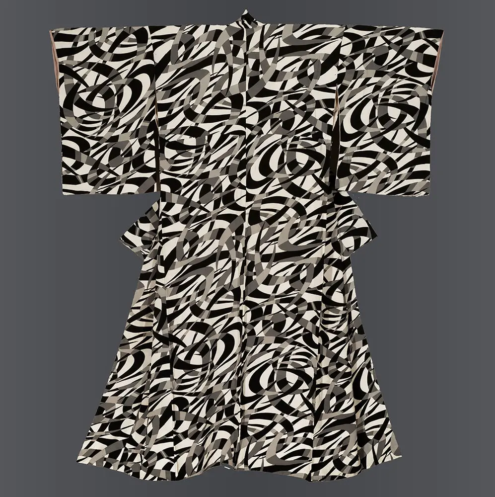 This striking textile represents a bold departure from traditional Japanese kimono design, embracing the radical aesthetic innovations of early 20th century modernist movements. The design features an all-over pattern of dynamic, interlocking curved forms rendered in black, white, and varying shades of gray through sophisticated stenciling techniques on chirimen silk.