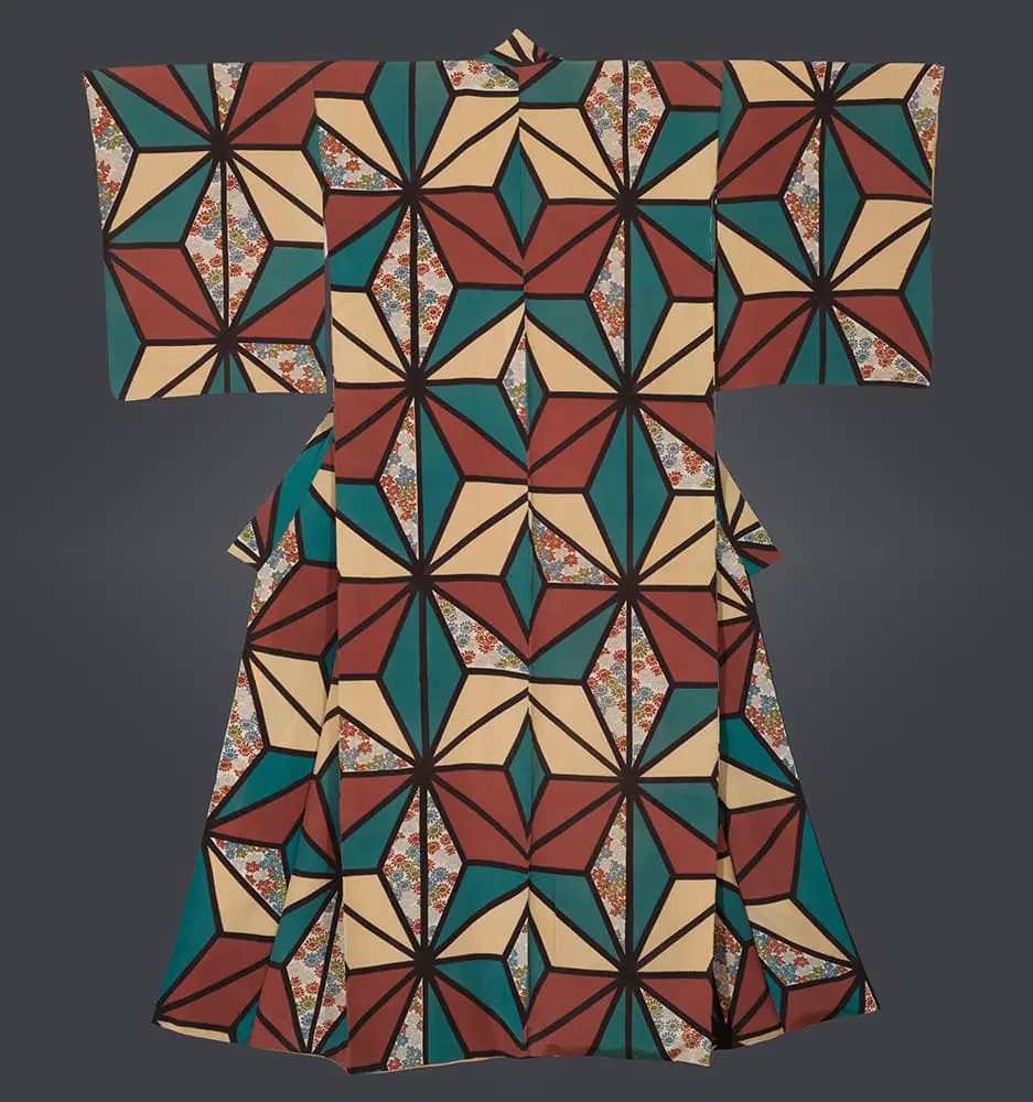 This silk kimono has a dramatic interpretation of the traditional asanoha (hemp leaf) pattern. The garment showcases how classic Japanese motifs were reimagined with modern graphic sensibilities during this transformative era.