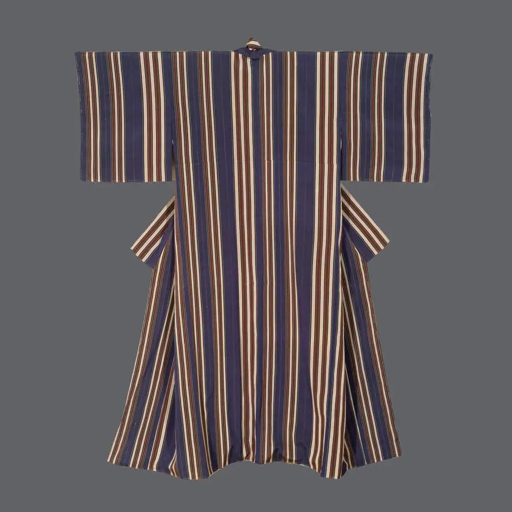 This silk kimono features precisely woven vertical stripes in deep indigo blue alternating with rich burgundy, cream, and dark green bands, punctuated by delicate metallic thread inserts that add subtle luminosity to the overall composition. The design demonstrates the influence of both traditional Japanese縞 (shima) stripe patterns and the period's growing awareness of European textile design, particularly the clean geometric lines that would later influence Art Deco aesthetics.