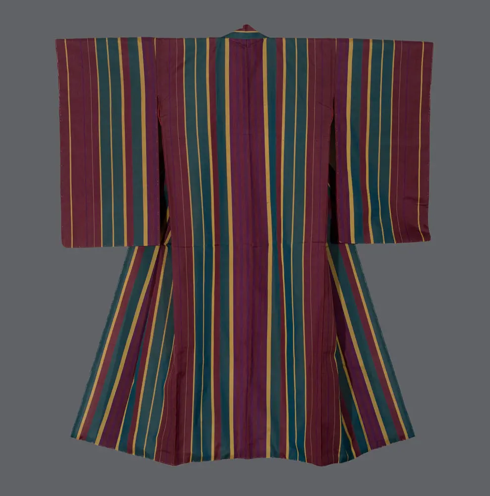 This woven kimono displays stripes and has a relatively firm texture. It's in very good condition, with slight imperfections. Measures 50 inches (127 cm) from sleeve-end to sleeve-end and stands 55 inches (140 cm) tall.