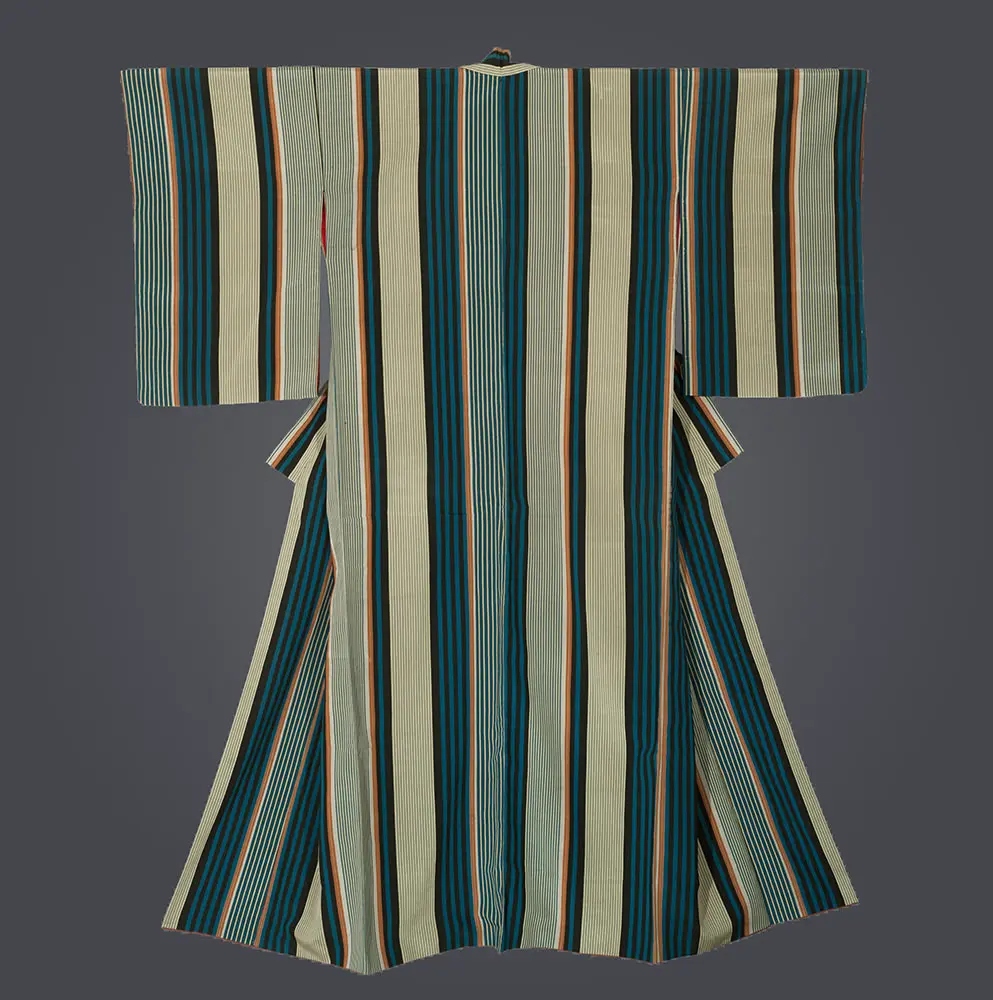 The technical mastery required to achieve this layered effect - combining vertical stripes with an intricately woven geometric damask pattern - demonstrates the exceptional skill of Japanese textile artisans. The result is a kimono that appears elegantly simple from a distance but reveals extraordinary complexity and refinement upon closer examination.