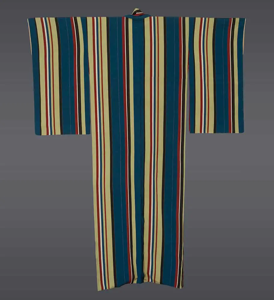 The kinsha (fine crepe) silk construction provides a subtle textural quality that enhances the visual richness of the stripes. The soft surface of the crepe silk would have created gentle light reflection, making the colors appear to shift slightly as the wearer moved. This type of refined striped kimono represents the Japanese aesthetic appreciation for understated elegance, where technical mastery in weaving and sophisticated color coordination create beauty through restraint rather than ostentation.