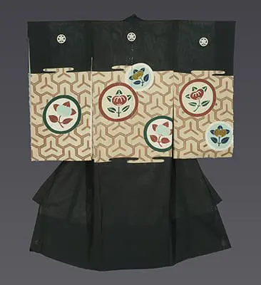 The art on this gauze silk summer child's ceremonial miyamairi kimono, features a striking contrast with solid black silk panels at the shoulders and hem adorned with white circular family crests (mon) symbolizing lineage and heritage, while the central body displays a beige ground woven in a intricate kikko (tortoise shell) hexagonal lattice pattern that evokes longevity, good fortune, and protection—drawing from the auspicious symbolism of the tortoise as a creature of enduring life and stability in Japanese tradition, often used in ceremonial garments to bestow wishes of health and prosperity upon the infant during their first Shinto shrine visit. Overlaid on this geometric base are scattered circular medallions enclosing stylized floral motifs in vibrant hues of red, blue, green, and brown—resembling peonies for prosperity and honor, chrysanthemums for rejuvenation and imperial nobility, and possibly plum blossoms for perseverance and early spring renewal—all common auspicious elements in miyamairi designs meant to invoke blessings of strength, wisdom, and harmonious growth for the child, blending traditional folklore with the garment's lightweight, breathable gauze weave suited for warm-weather rituals. This composition reflects the Taisho era's modernist flair, incorporating Art Deco influences through its bold geometric kikko framework and abstract, stylized florals that merge Japanese wagara patterns with Western-inspired eclecticism, embodying the period's cultural fusion of tradition and innovation in textile arts amid rapid societal changes.