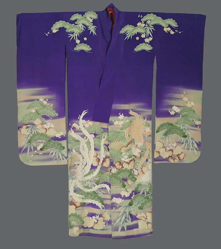 This striking blue silk furisode showcases designs created using the "yuzen" technique. The cranes and select flower designs are highlighted with satin stitch and sagara embroidery, adding depth and intricacy to the patterns. The inner linings continue the design, with the lower inner lining displaying the pattern and the upper inner lining in red silk. Both this kimono and #1463 were reportedly brought to the United States in the 1940s by a US Military Governor and diplomat who resided in Japan with his wife post-WWII to aid in restoration efforts. While in excellent condition, there are some minor tears along the neck lining. Its measurements are 52 inches across the sleeves and 72 inches tall.