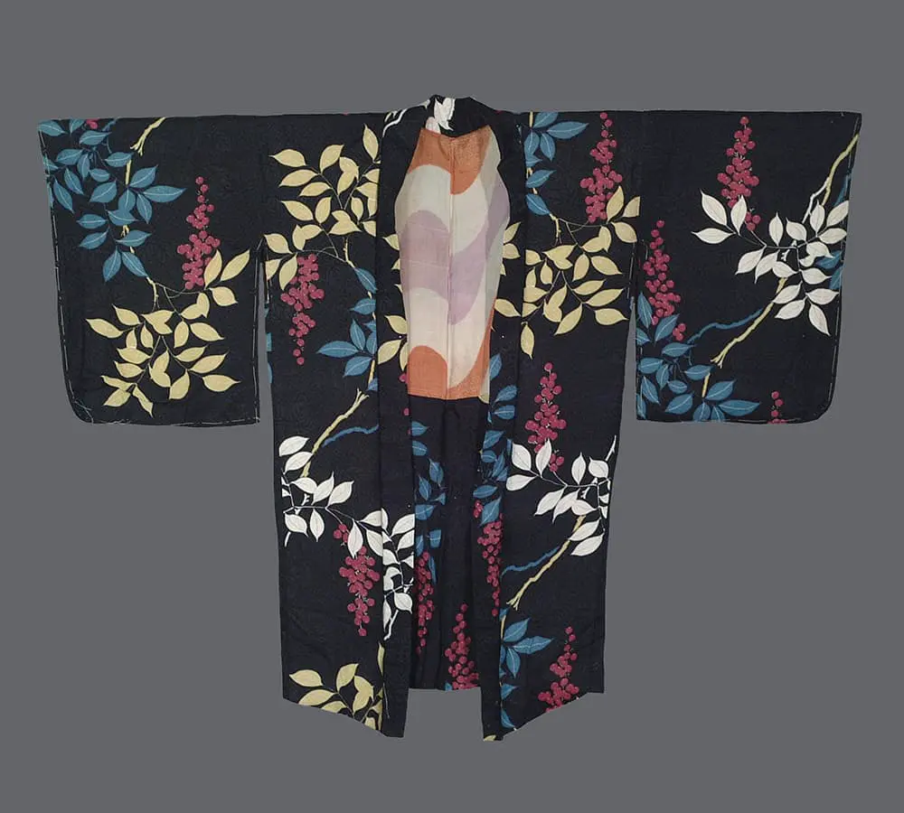 The composition displays a dramatic pattern of foliage and berries set against a deep black background. The design reveals gracefully rendered branches adorned with leaves and berries, creating a lively and naturalistic scene that seems to dance across the fabric. The foliage appears in a harmonious palette of colors that pop against the dark backdrop. Delicate leaves emerge in shades of pale yellow and crisp white, while others appear in a cool, muted blue. Clusters of small, round berries in a soft coral hue add a splash of warmth and vibrancy to the composition. The floral and botanical motifs evoke the organic, flowing forms characteristic of Art Nouveau, while the stylized, simplified shapes of the leaves and berries suggest influences from Art Deco. The bold contrast between the dark background and the brightly colored foliage is reminiscent of techniques used in Japanese ukiyo-e prints.