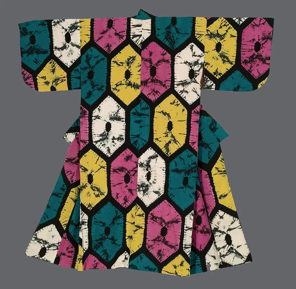 This silk kimono is adorned with kikko motifs crafted using the shibori tie-dye technique, presenting a dynamic all-over pattern of interlocking hexagons in vivid, contrasting hues of teal, yellow, magenta, white against a dark ground, where each polygonal cell features radial, burst-like resist-dyed designs achieved through the intricate process of binding, stitching, and dipping fabric in multiple dye baths to create uneven, organic spreads of color that mimic explosive floral or stellar forms, reflecting the technique's ancient origins in Japan dating back to the 6th-7th centuries as a method for producing complex, textured patterns on luxury garments. This bold, geometric composition evokes the lingering influence of Art Deco from the earlier Taisho and early Showa eras, characterized by stylized modernism, eclectic color palettes, and abstract motifs that blended Western geometric trends with traditional Japanese aesthetics during a time of cultural fusion and post-war revival, as seen in the era's textiles that embraced vibrant prints and synthetic innovations amid material shortages, though silk persisted for high-end pieces. The kikko motif, inspired by the tortoise shell, carries deep symbolism of longevity, protection, good fortune, and resilience in Japanese culture, often incorporated into samurai armor and auspicious garments to ward off evil and invoke prosperity, making it particularly fitting for a mid-20th-century kimono that bridges pre-war opulence with the era's themes of endurance and renewal following wartime hardships.