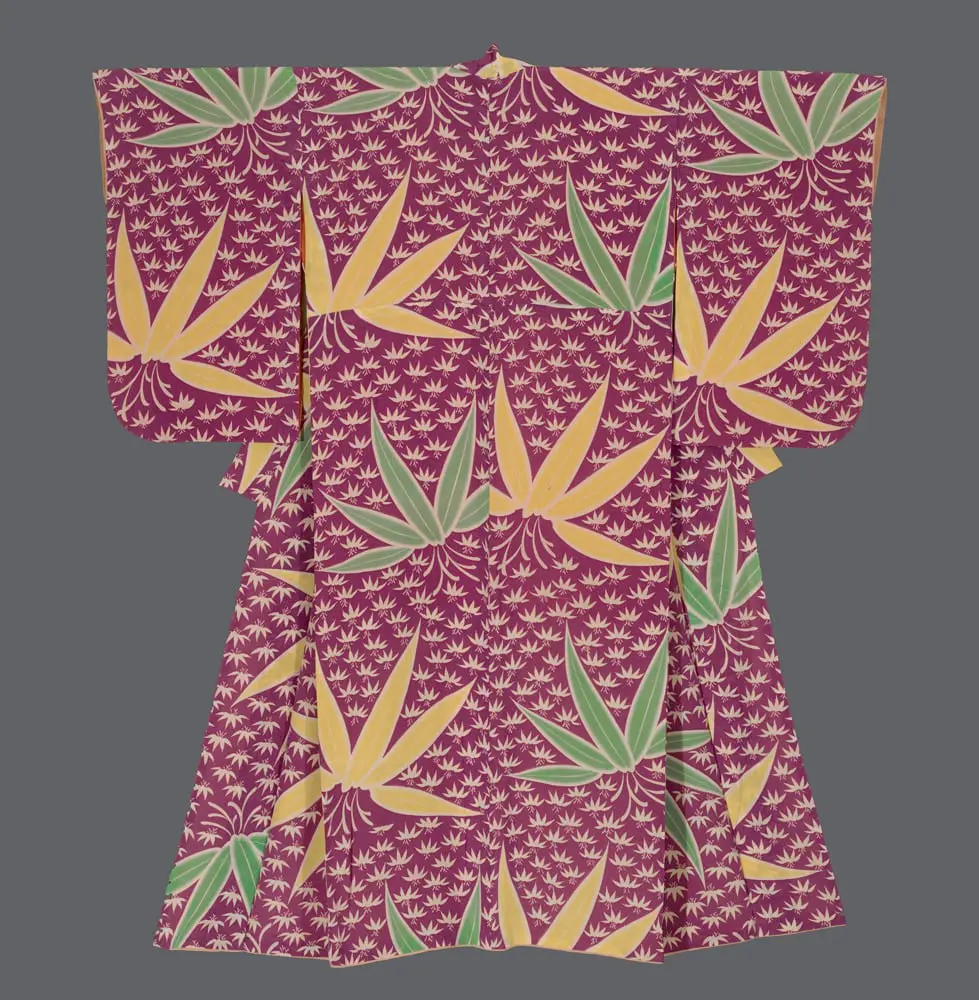 This kimono features a vibrant and graphic representation of the traditional asanoha, or hemp leaf motif. The design is rendered in a bold color palette of deep magenta, citron yellow, and muted green, a combination that speaks to the aesthetic sensibilities of the era. The silkscreened pattern is characterized by its dynamic composition, with large, stylized hemp leaves overlaid on a smaller, repeating background of the same motif. This layering creates a sense of depth and visual complexity, drawing the eye to the interplay of scale and color. The leaves are not depicted with botanical realism, but rather with a flattened, graphic quality, their veins articulated by fine lines that add a sense of texture and movement.