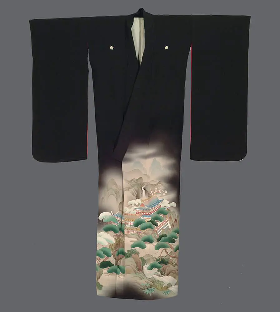 This antique kurotomesode features silkscreened landscape across the lower hem. The garment is crafted from high-quality black silk, serving as the most formal attire for a married woman. The scenic design depicts a classical mountain retreat, complete with traditional architectural pavilions, cascading waterfalls, and misty peaks, all framed by vibrant green pine trees and delicate white plum blossoms.