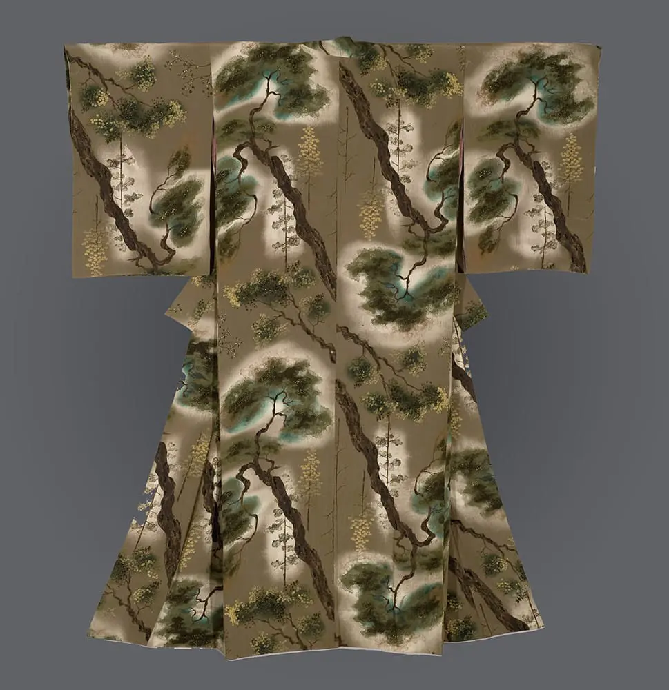 This Taisho period silk kimono presents a sophisticated naturalistic design featuring graceful painted tree motifs rendered in an earthy, muted palette. The artwork demonstrates the masterful combination of stenciling and hand-painting techniques characteristic of high-quality Japanese textile production of the early 20th century.