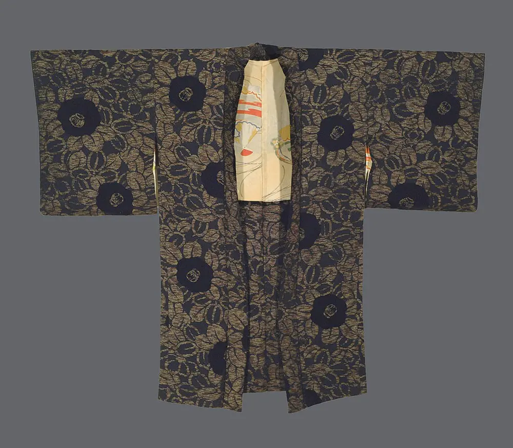 This silk haori is a masterpiece of textural contrast and technical sophistication, featuring a dense botanical composition rendered through the rare urushi (lacquer) coated thread technique. The garment is crafted on a dark, charcoal-bronze silk ground, which provides a somber architectural field for its high-relief surface decoration.