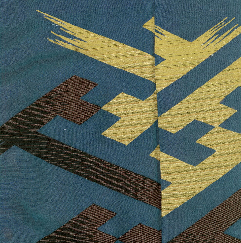 The close-up details reveal the sophisticated technical execution, where approximately half the motifs are enhanced with supplementary urushi-coated threads that create lustrous, lacquer-like surfaces in contrasting colors. This innovative technique combines traditional Japanese lacquer artistry with textile production, resulting in motifs that appear to float above the silk ground with dimensional brilliance. The urushi threads not only add visual richness but also symbolic weight, as lacquer in Japanese culture represents durability, protection, and refinement. The geometric fragmentation and bold color contrasts suggest influences from Western avant-garde movements while maintaining distinctly Japanese sensibilities in the interplay of materials and the overall compositional balance. This kimono exemplifies the experimental spirit of early 20th-century Japanese textile artists who successfully merged traditional craft techniques with international modernist aesthetics.