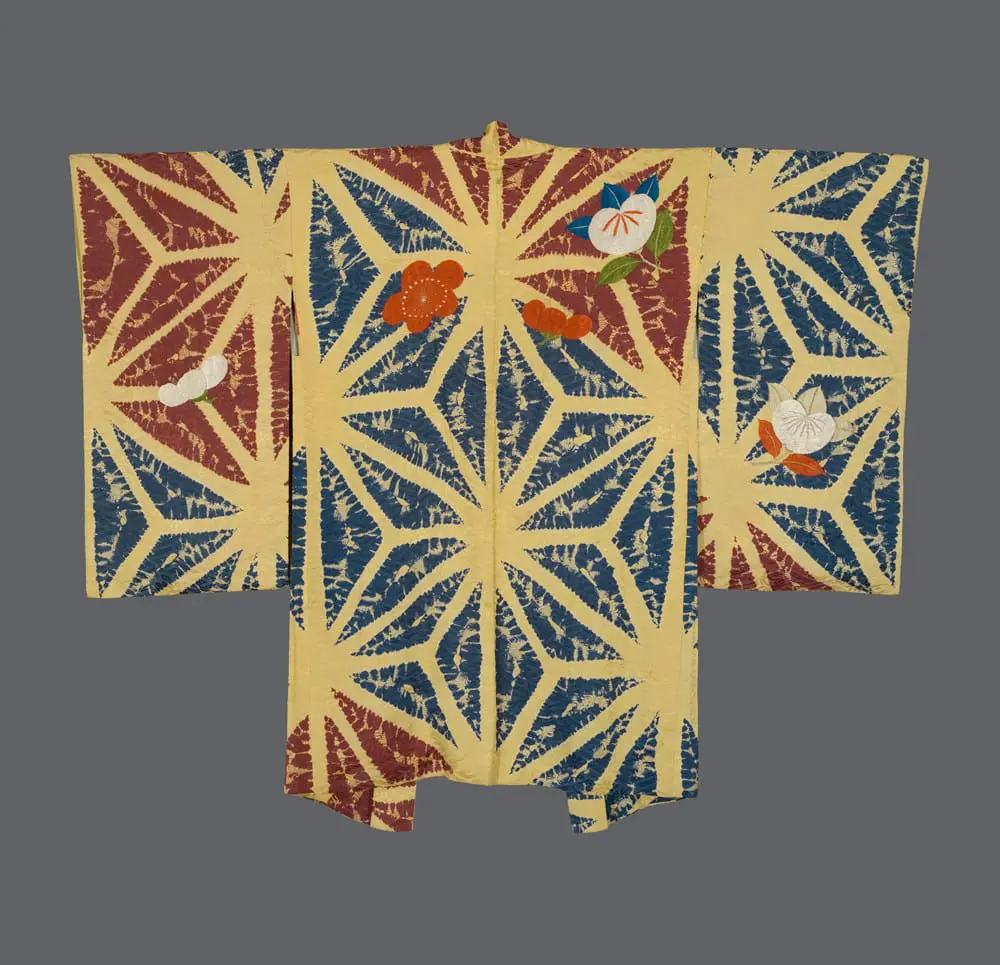 This striking haori is adorned with bold hemp-leaf motifs created using the wax-resist technique known as roketsuzome, which is similar to the batik method used in Indonesia. This technique involves applying wax to the fabric to resist dye, resulting in the vibrant and intricate patterns seen on this garment. Superimposed on this striking background are delicate embroidered tachibana motifs. These naturalistic elements provide a soft, organic counterpoint to the rigid geometry of the hemp-leaf pattern, creating an intriguing visual tension. The background alternates between deep blue and burgundy sections, adding depth and contrast to the design. This color-blocking technique further emphasizes the modernist influence, creating distinct areas of color that interact with the overarching pattern.