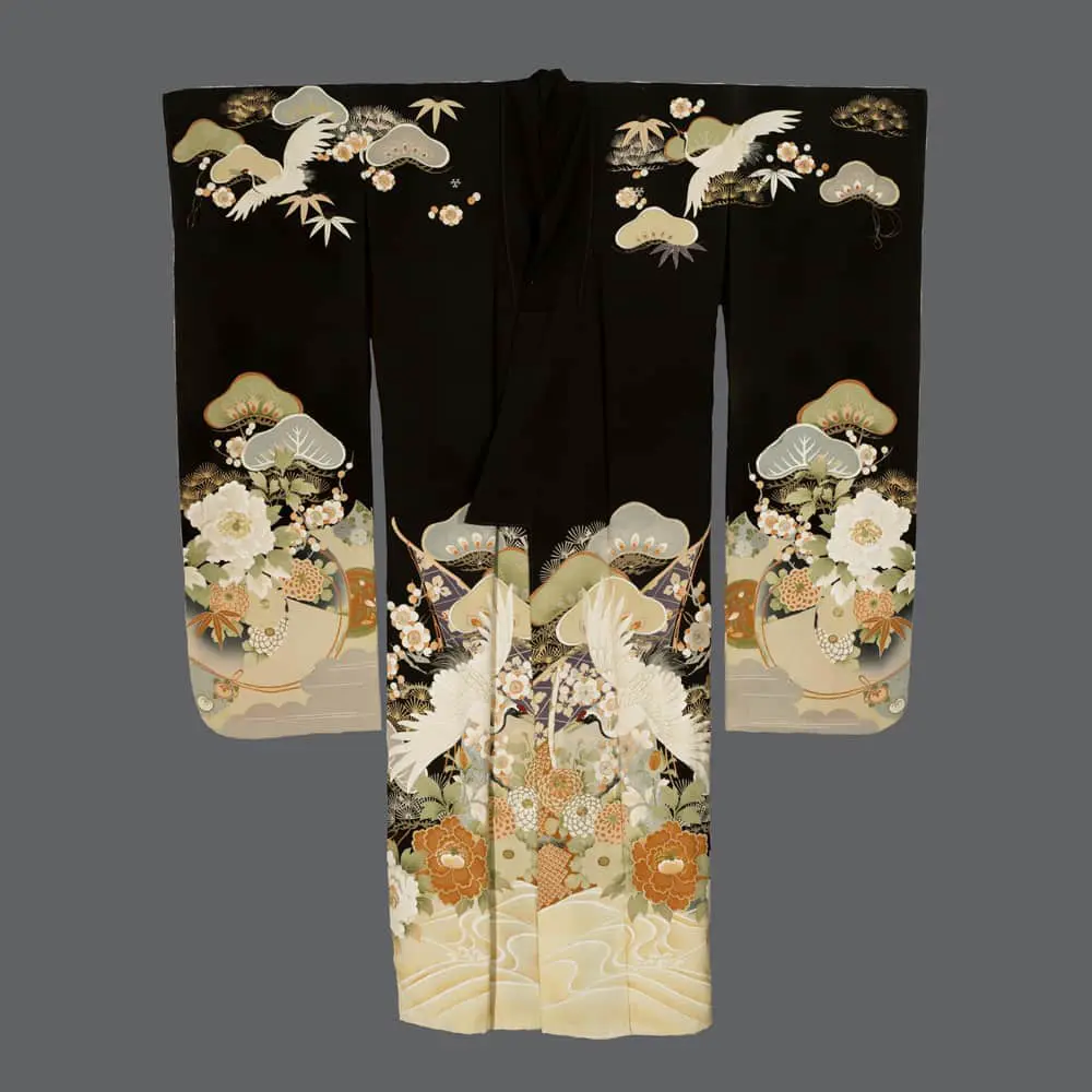 The symbolic program of this kurofurisode is deeply rooted in Japanese wedding traditions and seasonal celebrations. White cranes soar gracefully across the upper portions of the garment, representing longevity, fidelity, and marital happiness—these birds mate for life and were considered messengers of the gods. Pine boughs (matsu) symbolize steadfastness and eternal youth, while the abundant chrysanthemums and other seasonal flowers speak to prosperity, nobility, and the cyclical renewal of life. The fan motifs scattered throughout the composition represent expanding fortune and the unfolding of a bright future, while the flowing water patterns at the hem evoke purification and the continuous flow of blessings in married life.