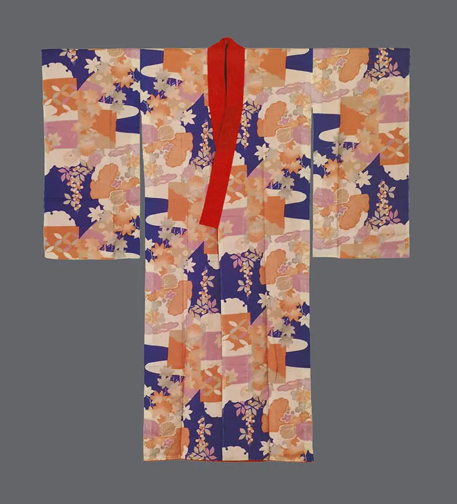 This printed cotton juban (under-kimono) is a vibrant and graphically dense example of mid-century textile design, likely intended for a woman or young woman. The garment is characterized by a complex, interlocking composition of geometric and botanical motifs in a rich palette of navy blue, coral-orange, lavender, and cream.