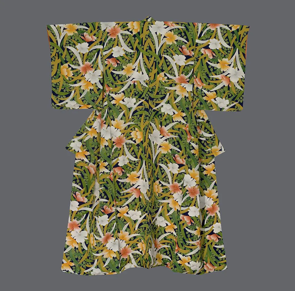 The artistic treatment reflects the embrace of Western design influences while maintaining distinctly Japanese aesthetic principles. The way the flowers and leaves interweave creates a sense of movement and depth that transforms the kimono into a wearable canvas, embodying the period's experimental spirit in fashion and textile arts. The heavier chirimen silk construction, intended for winter wear, provides an ideal foundation for this rich, layered design.