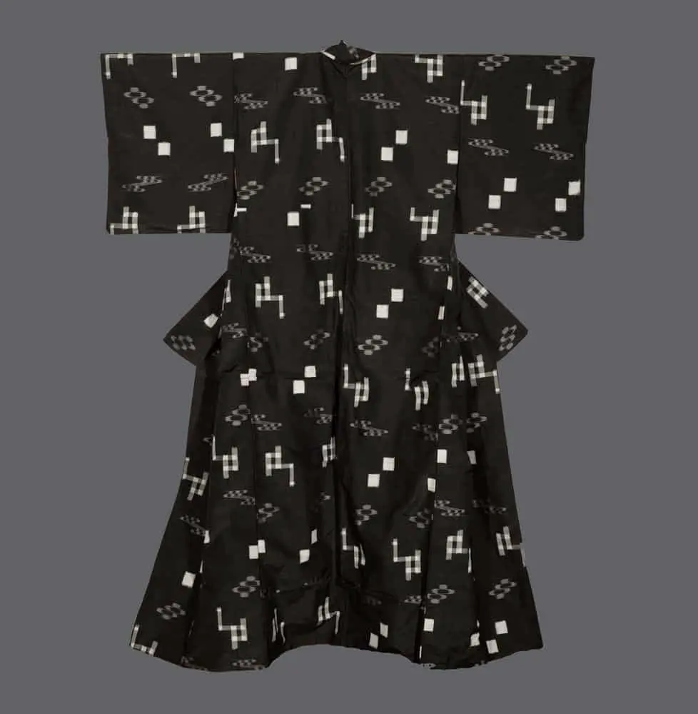 This synthetic winter kimono imitates the kasuri style. It carries a relatively heavy feel and is in very good condition, despite showing patina staining on the inner lining. Its measurements are approximately 49 inches (124 cm) from sleeve-end to sleeve-end and 57 inches (145 cm) in height.