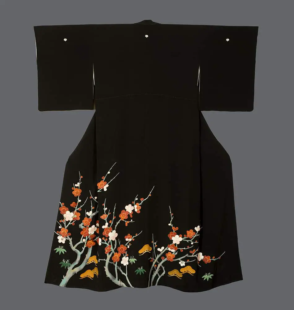 Overall, the kurotomesode visually celebrates seasonal transition and the hope for resilience, aligning its symbolism with both ceremonial propriety and the artistic spirit of mid-century Japan, where tradition and subtle innovation coexisted.