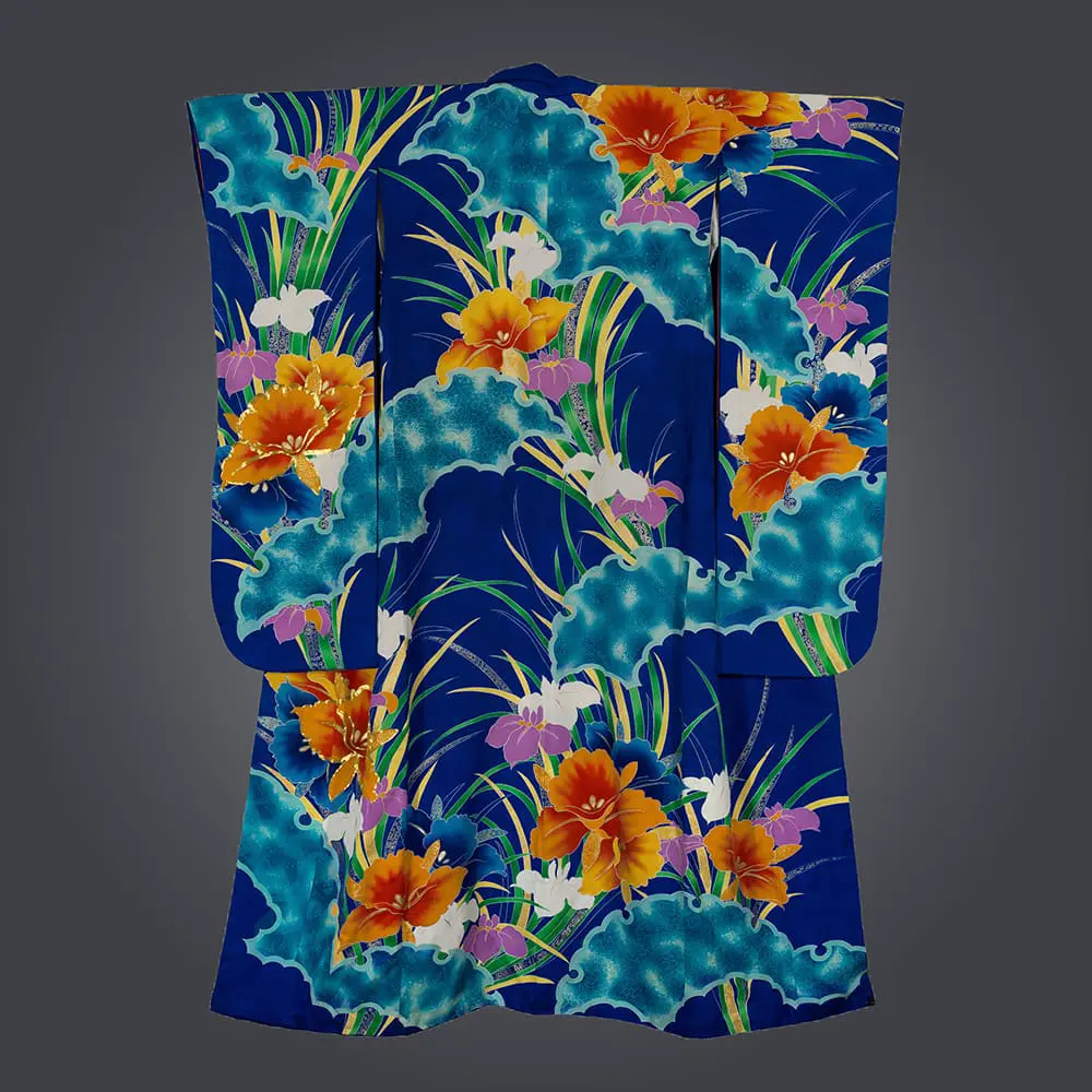 Spanning about 51 inches (130 cm) from sleeve-end to sleeve-end, this furisode stands tall at approximately 69 inches (175 cm).