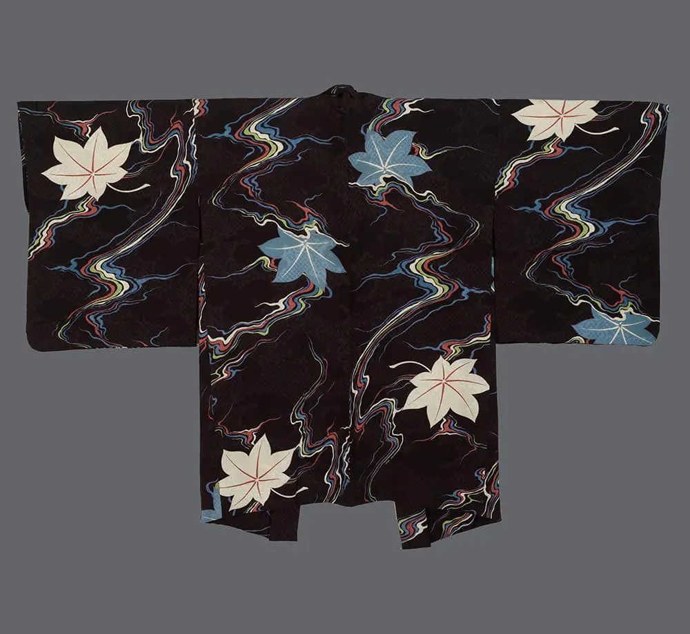 Crafted from luxurious rinzu fabric, this haori features large, stylized maple leaves rendered in soft blues and creams that stand out vividly against the rich, dark background. The interplay of these colors creates a striking contrast that draws the eye to the intricate details of the leaves. The flowing, undulating lines that weave through the composition suggest a dynamic sense of movement and fluidity. These lines, which include accents of white, blue, red, and yellow, resemble swirling water or wind, adding a natural, elemental quality to the piece.