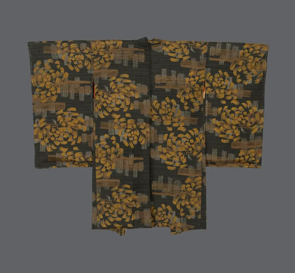 The chrysanthemum, Japan's imperial flower and symbol of autumn, carries profound cultural significance representing longevity, rejuvenation, and nobility. During this period of rapid modernization and social change, the prominence of this traditional motif suggests both cultural continuity and the enduring strength of Japanese identity. The vibrant shibori-dyed inner lining, with its gradient from golden yellow to coral orange, reveals the garment's hidden luxury and demonstrates the period's technical innovation in textile dyeing. This interior burst of warm color creates a striking contrast with the exterior's more subdued palette, embodying the Japanese aesthetic concept of iki—sophisticated restraint with hidden depths of beauty.