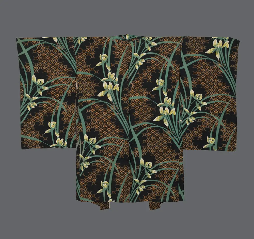 The design of this rayon haori is a striking fusion of organic forms and geometric patterns, creating a harmonious whole. The design is dominated by graceful, stylized daffodil-type flowers with elongated green stems and leaves, rendered in a bold, graphic style that echoes the streamlined forms popular in Art Deco design. These floral elements are artfully arranged against a background of intricate shokkou patterns.