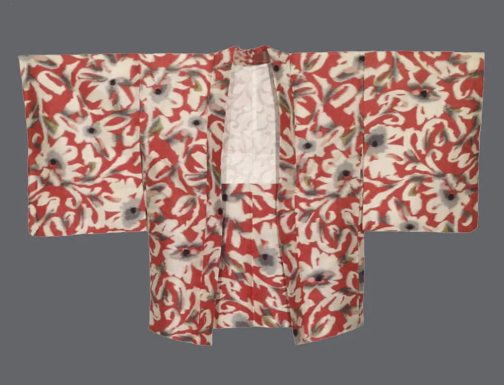 This silk haori is a bold example of Mid-Showa period textile design, utilizing the era's signature weaving technique to create a vibrant, graphic composition. The garment is crafted from meisen silk, a material celebrated for its crisp texture and the use of pre-dyed threads that result in slightly blurred, "shimmering" edges.