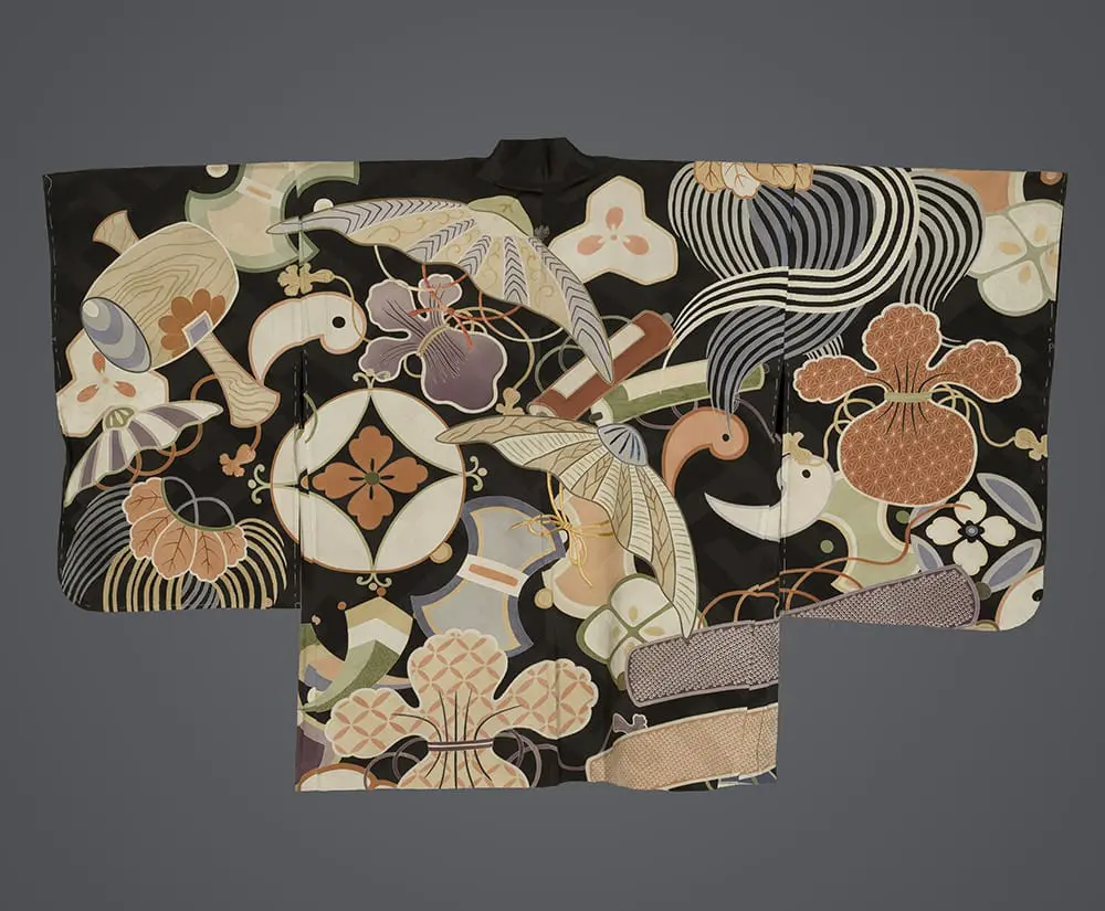In terms of influence, this haori's design is deeply rooted in traditional Japanese aesthetics. The use of auspicious motifs, the complex composition, and the rich color palette are all characteristic of traditional Japanese textile art. The overall design is also evocative of the decorative richness found in traditional Japanese paintings, screens, and lacquerware.