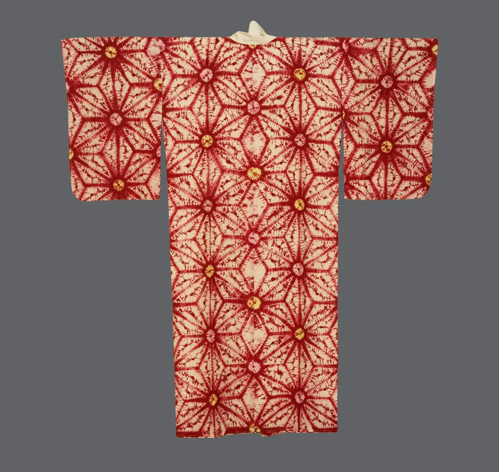 This silk juban demonstrates the masterful application of shibori tie-dye techniques to create an intricate asanoha (hemp-leaf) pattern across the entire garment. The design showcases interlocking hexagonal motifs that radiate outward in star-like formations, each centered with small golden accents that punctuate the rhythmic geometry. The asanoha pattern holds profound symbolic meaning in Japanese culture, representing growth, prosperity, and protection from evil, making it particularly appropriate for undergarments that sit closest to the body.