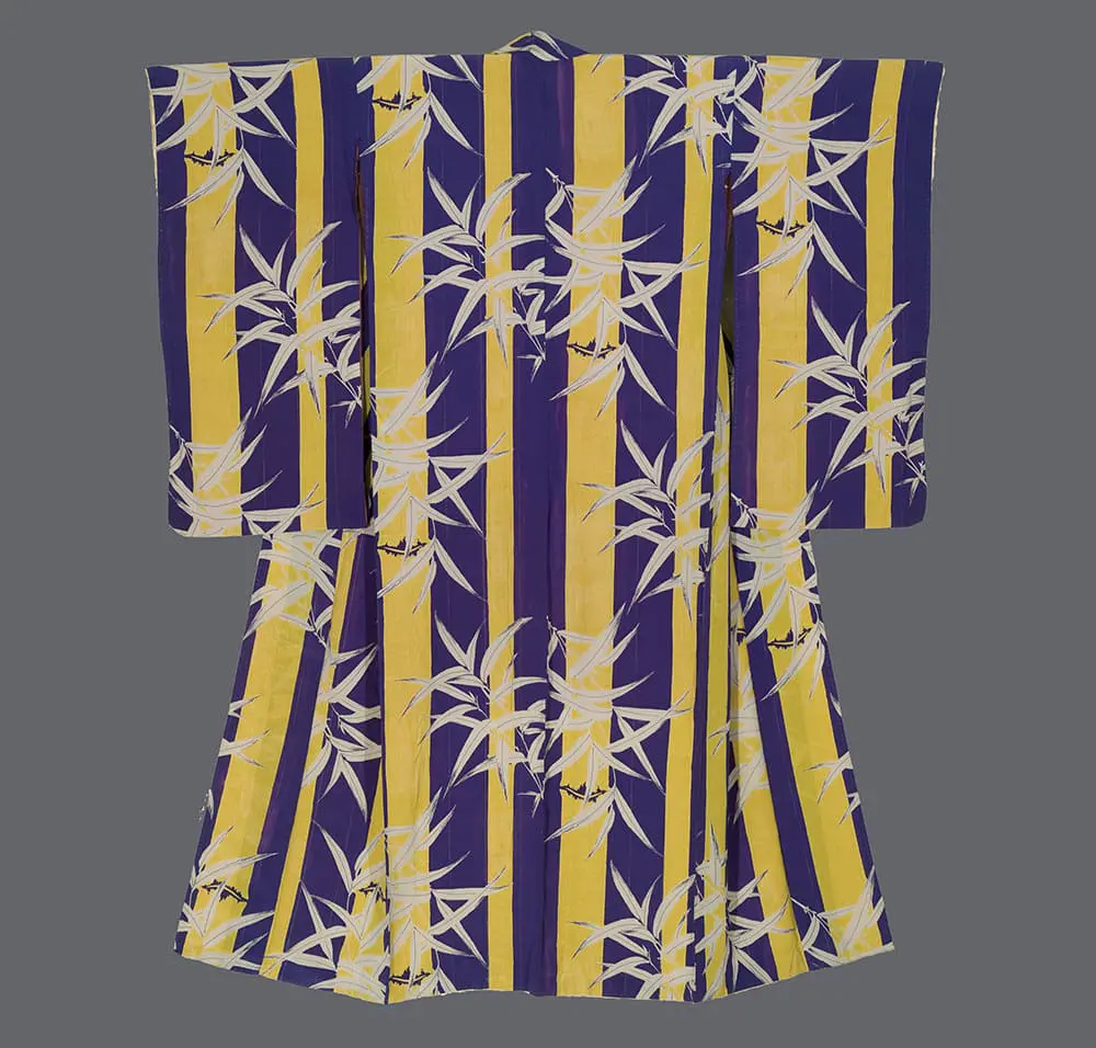 This silk kimono showcases a yuzen-dyed bamboo pattern over bold alternating blue and yellow vertical color bands, with sporadic metallic thread highlights. It features a red silk momi-silk lining and is in very good condition, though there are several small areas of discoloration. It measures 49 inches (124 cm) from sleeve-end to sleeve-end and stands at 59 inches (150 cm) tall.