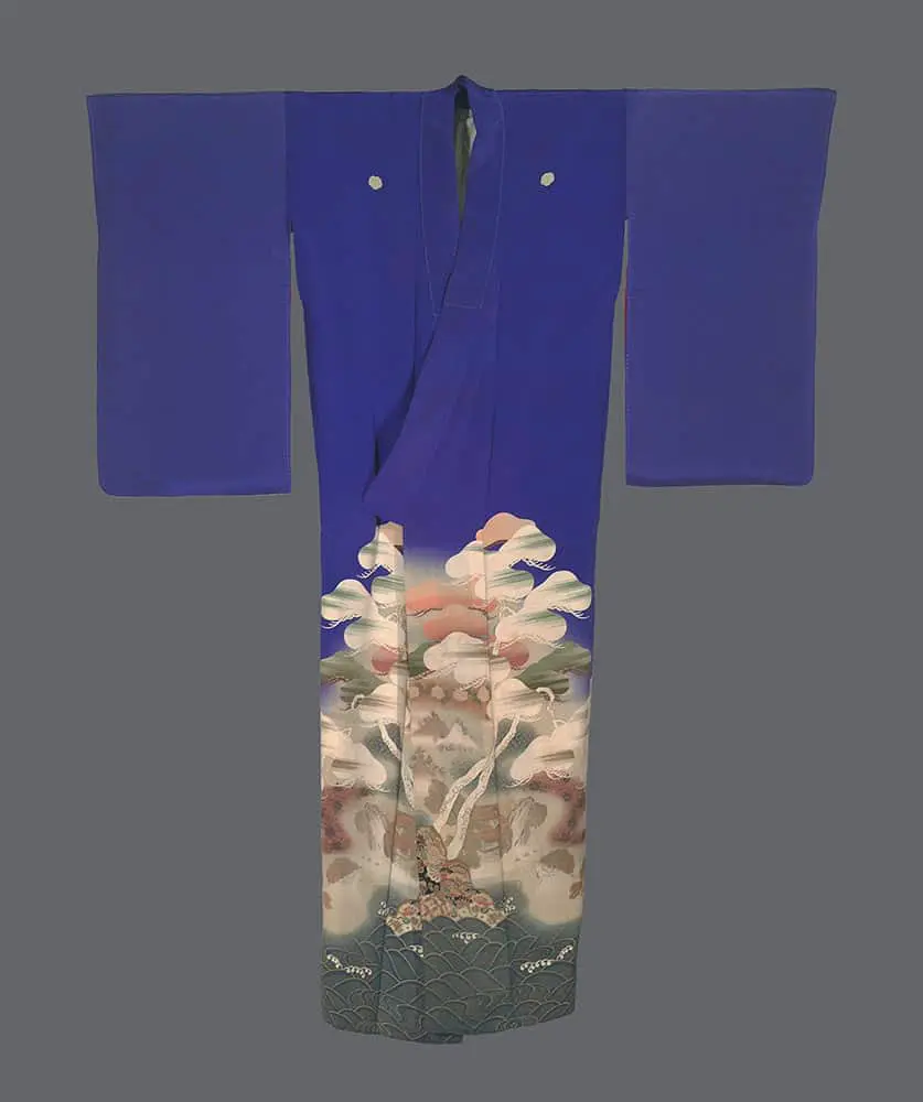 The pine and sea motifs carry deep symbolic resonance in Japanese culture, with pines representing longevity, steadfastness, and nobility, while the sea suggests the eternal and infinite. These elements are rendered with the delicate naturalism characteristic of Japanese textile art, featuring subtle gradations of color and flowing, organic forms that contrast beautifully with the bold geometric treatment of the upper portion. The wave patterns at the hem, executed in traditional seigaiha (blue ocean waves) style, create a sense of movement and rhythm that grounds the garment's more avant-garde color blocking in classical Japanese visual vocabulary.